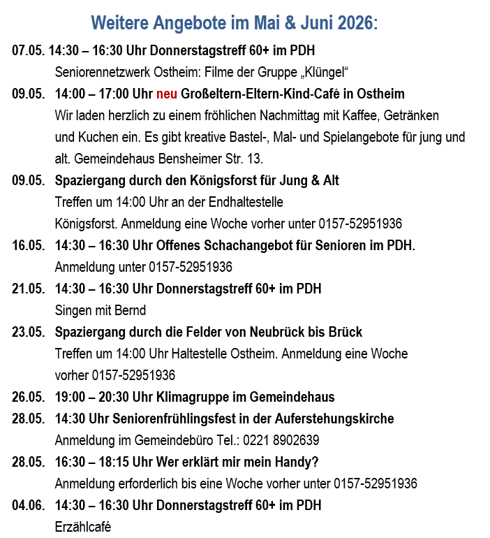 - Anmeldungen bitte im Gemeindebüro unter 0221 89 02 639.